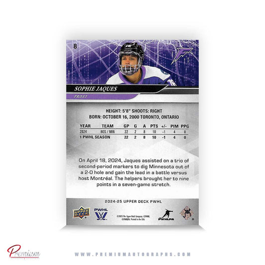 Sophie Jaques Minnesota Frost Autographed 2024-25 Upper Deck PWHL Hockey Card #8 Ltd /16 Nicknames edn. w/ "Soph" Inscription