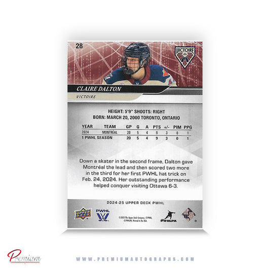 Claire Dalton Montreal Victoire Autographed 24-25 Upper Deck PWHL Hockey Card #28 Ltd /42 Nicknames edn. w/ "Dalts" Inscription