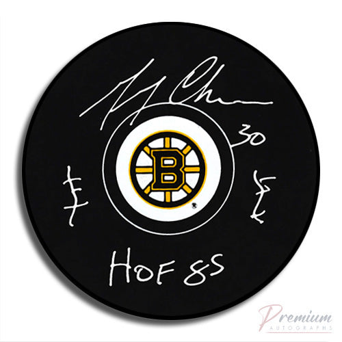 Gerry Cheevers Boston Bruins Signed Puck w/ HOF 85 & Stitches Inscription