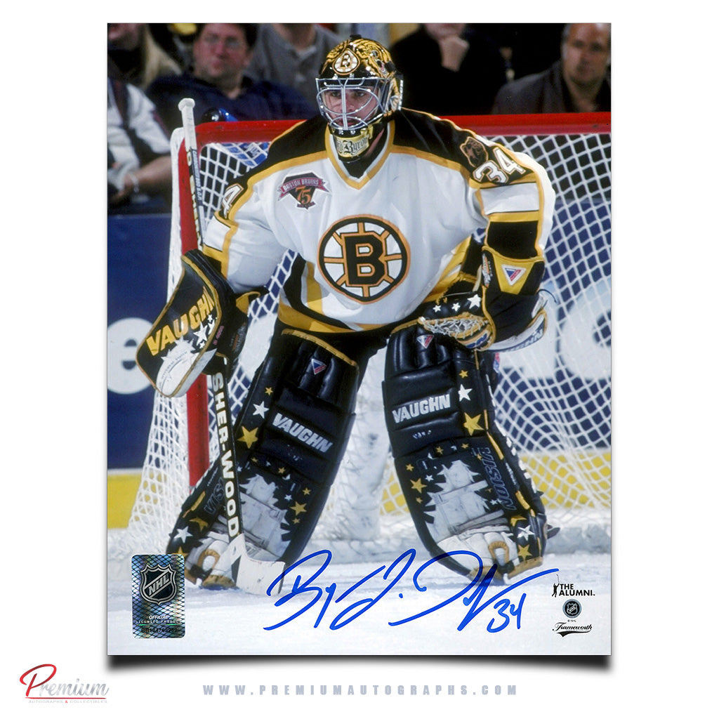 This is a Byron Dafoe Boston Bruins Signed 8x10 Photograph Against the Post