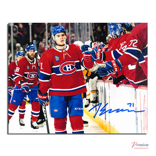This is a Jake Evans Montreal Canadiens Signed 8x10 Bench Celebration