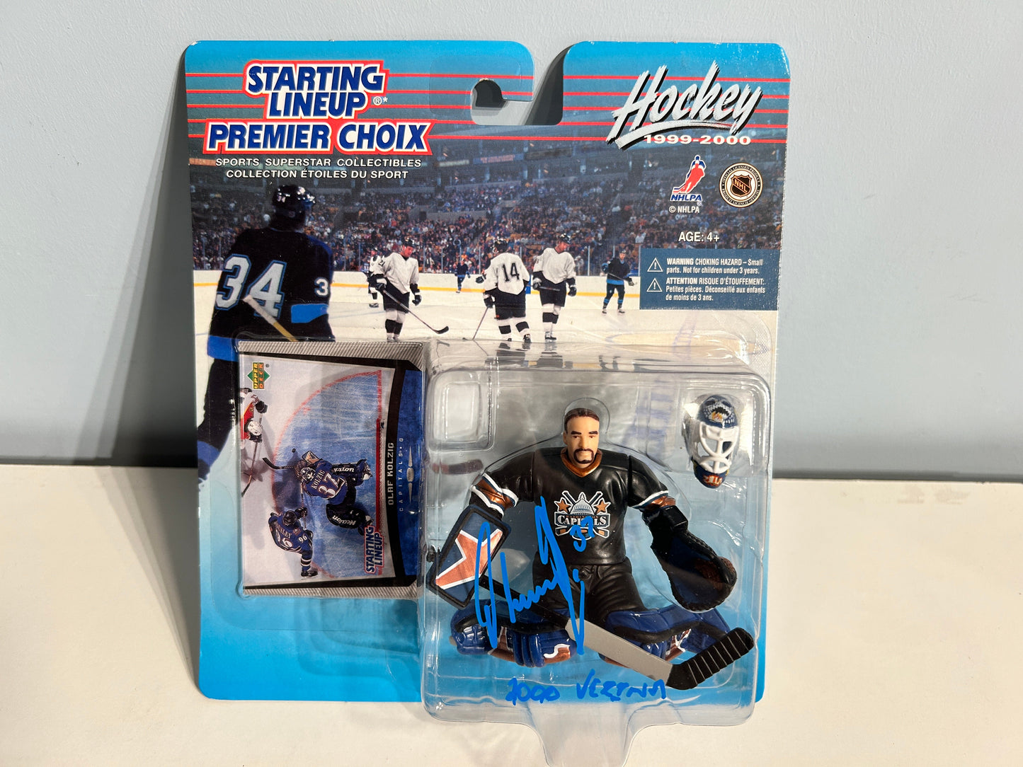 This is a Olaf Kolzig Washington Capitals Autographed Starting Lineup Figure w/ 2000 Vezina Inscription