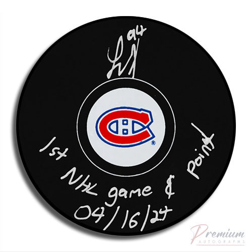 Logan Mailloux Montreal Canadiens Signed Puck w/ 1st Game & 1st point Inscription