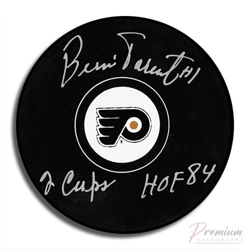 Bernie Parent Philadelphia Flyers Signed Puck w/ 2 Cups & HOF Inscription