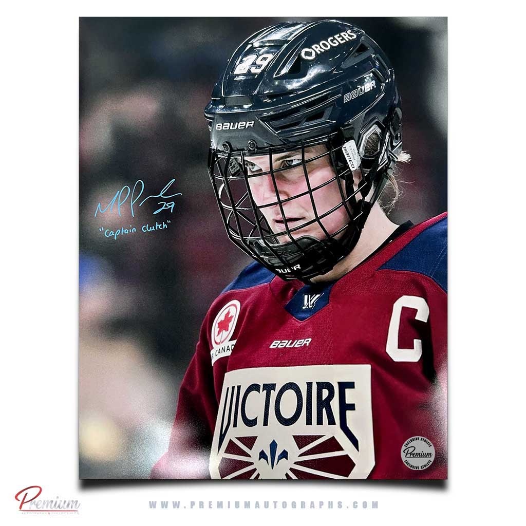 This is a Marie-Philip Poulin Montreal Victoria PWHL Signed 16x20 Photograph Close Up w/ Captain Clutch Inscription